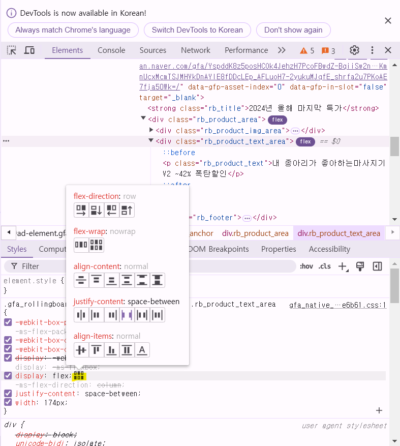 크롬 브라우저에서 웹사이트로 가서 `개발자 도구 > 스타일 탭` 를 열면 화면 레이아웃에서 flex 가 적용된 부분을 보여준다. GUI 기능으로 다섯가지 플렉스 요소를 간편하게 적용해볼 수 있다.