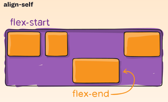 부모 컨테이너의 align-items 속성이 모든 플렉스 아이템에 적용되는 기본 정렬 방식이라면, align-self는 특정 아이템에 대해서만 이 값을 오버라이드 해서 정렬을 다르게 설정할 수 있게 해준다.