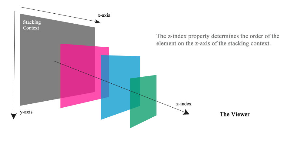 z-index를 이해하기 위해선 먼저, 쌓임 맥락(Stacking Context)의 개념을 이해해야 한다. 쌓임 맥락이란, HTML 요소들에 사용자를 바라보는 기준으로 가상의 z축을 생성하여 3차원 개념으로 보는 것 이다. 따라서, 쌓임 맥락을 형성한다는 것은 자신만의 3차원 공간을 형성하는 것이며 그 요소들의 우선순위를 z-index가 정하게 되는 원리이다.