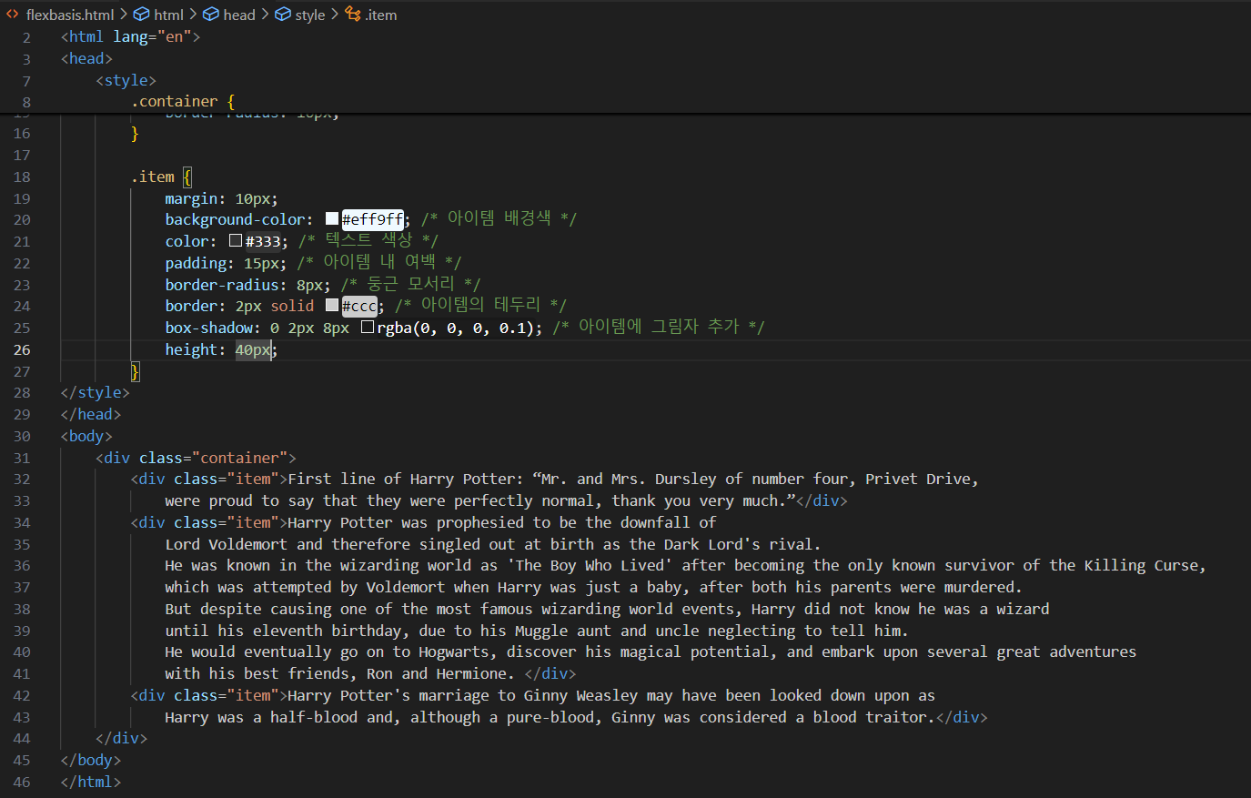 만약 그냥 flex item에 height를 40px로 적용하면 이렇게 긴 글은 item 박스 크기를 넘어간다.