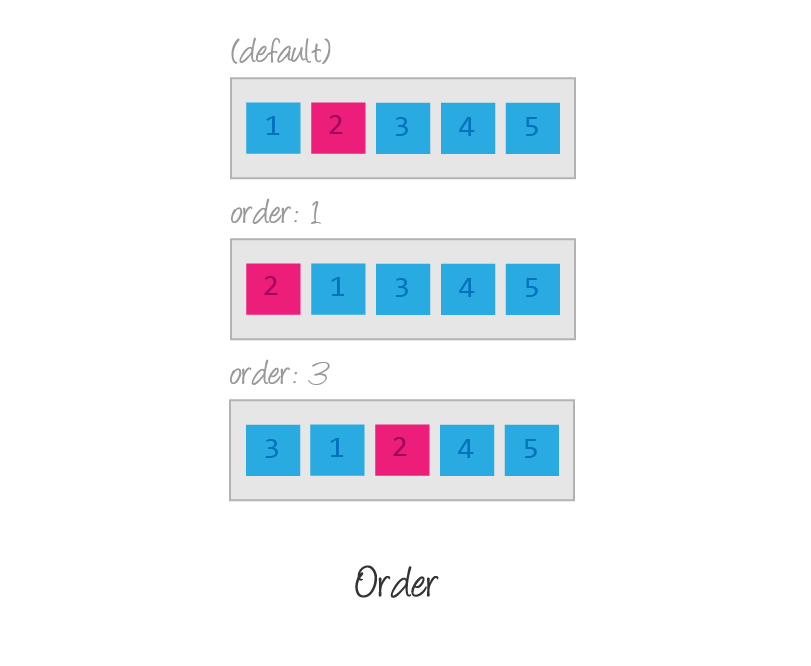 order 속성은 플렉스 컨테이너안의 아이템들이 나타나는 순서를 변경하는 데 사용된다. 기본적으로 플렉스 아이템은 HTML 문서에 정의된 순서대로 배치되지만, order 속성을 사용하면 아이템의 순서를 시각적으로만 변경할 수 있다.