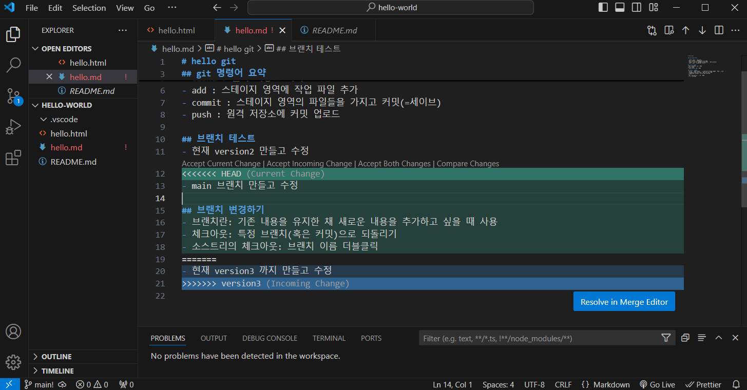 main을 선택하고 version3를 메인에 병합하려고 하는데 충돌이 났다.
