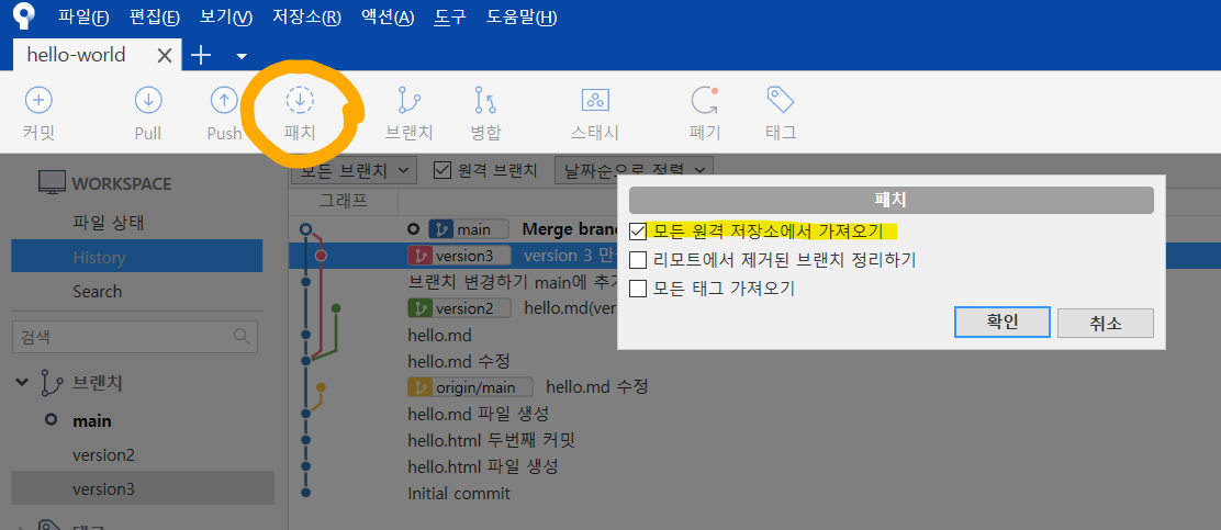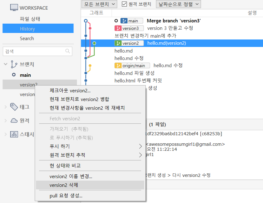 hello.md 우클릭 > 브랜치 생성
