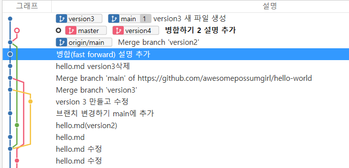 반대로 fast forward형식으로 version3을 master에 병합하면 master이 위로 안올라오고 병합한 버전 옆에 나란히 위치한다.