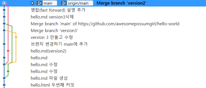 예를 들어서 HEAD브랜치가 main이고 여기서 version2 브랜치를 병합하면 version2의 내용이 main에 반영되게 된다.