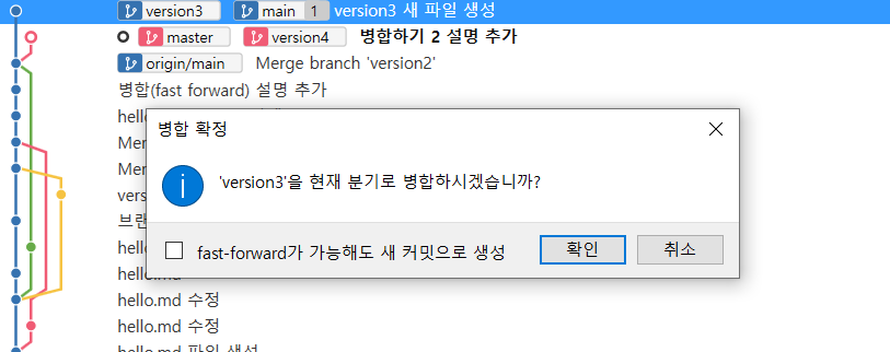 master에 체크아웃 하고 version4 눌러서 병합하면 version4가 master로 병합됨