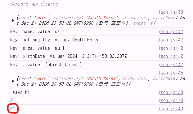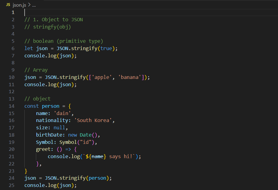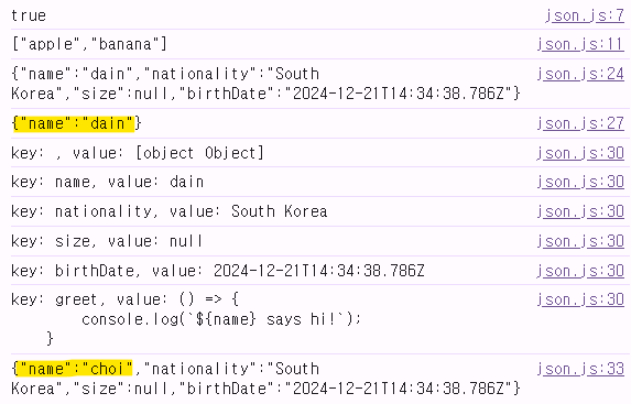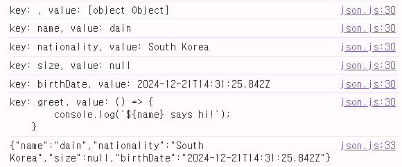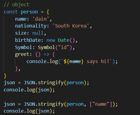 // 출력: {"name":"dain","nationality":"South Korea","size":null,"birthDate":"2024-12-21T00:00:00.000Z","Symbol":"Symbol(id)","greet":"() => {\n console.log(`${name} says hi!`); \n }"}