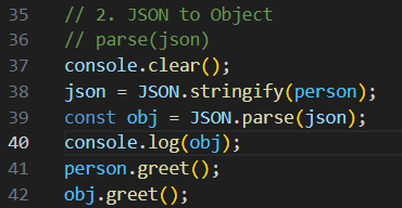 따라서 JSON을 다시 obj로 변환해도 처음부터 greet라는 함수가 안 들어있었기 때문에