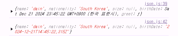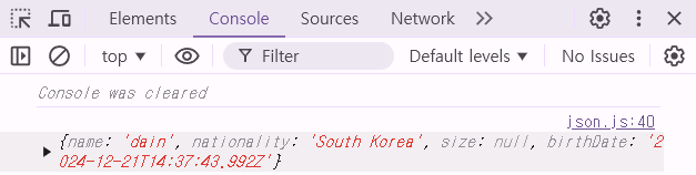 // 출력: {"name":"dain","nationality":"South Korea","size":null,"birthDate":"12/21/2024"}