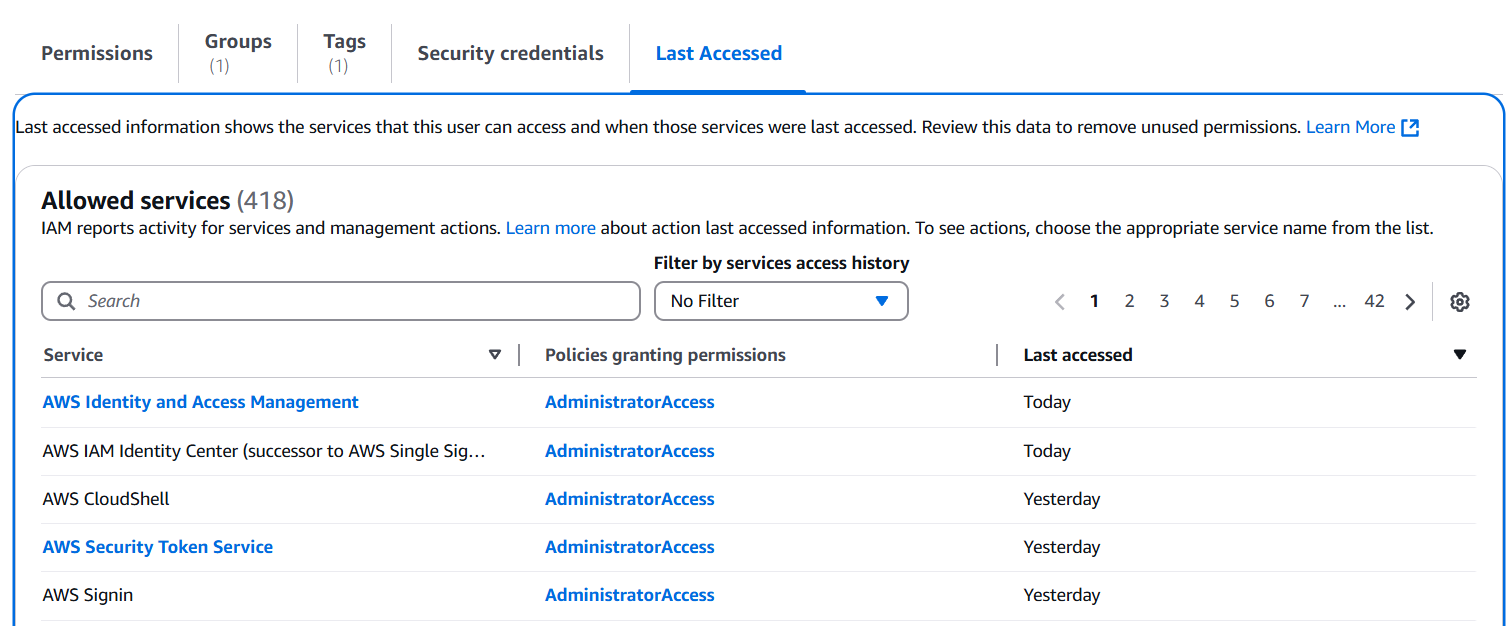 IAM Management Dashboard > Users > click your IAM Account Name > Access Advisor 또는 Last Accessed >
