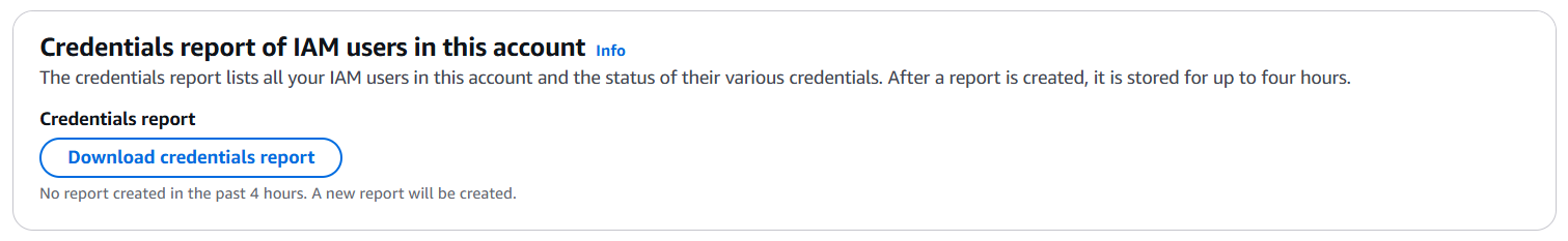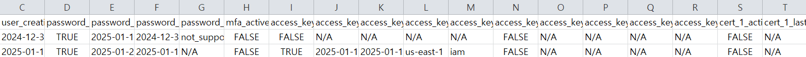 - 사용자 생성 시기, 비밀번호 활성화 되었는지, 비밀번호가 마지막으로 변경된 시기, 마지막으로 사용된 시기, 다음 교체가 언제 예상되는지, MFA가 활성화 되어 있는지, 액세스 키가 생성되어 있는지, 액세스키 마지막 교체시기, 액세스키 마지막 사용시키, 다른 액세스 키나 인증번호 사용 상태 등을 보여줌