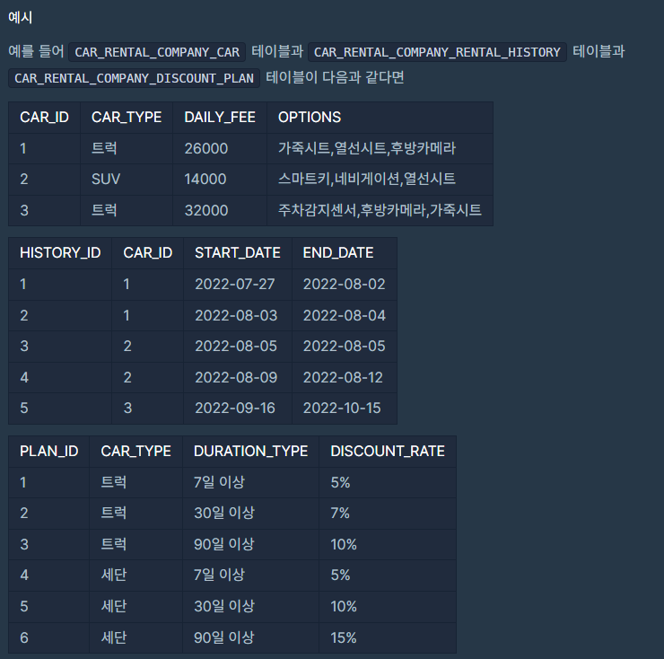 | 대여 중인 자동차들의 정보 | 자동차 대여 기록 정보 | 자동차 종류 별 대여 기간 종류 별 할인 정책 정보 |