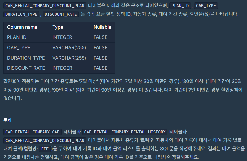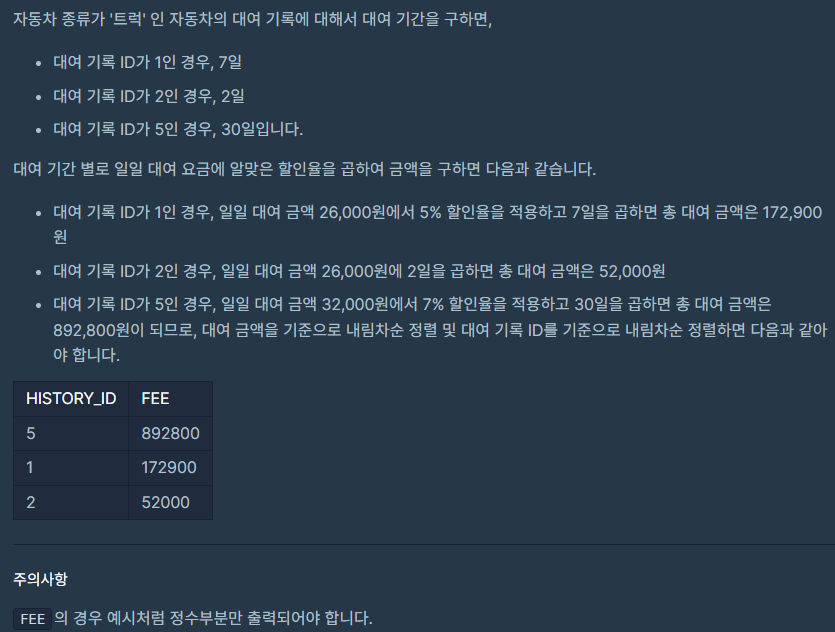 자동차 종류별, 기간별로 할인율이 다른데 종류는 이미 '트럭'으로 한정되어 있기 때문에 서브쿼리에서 기간별로 JOIN을 해야 한다.