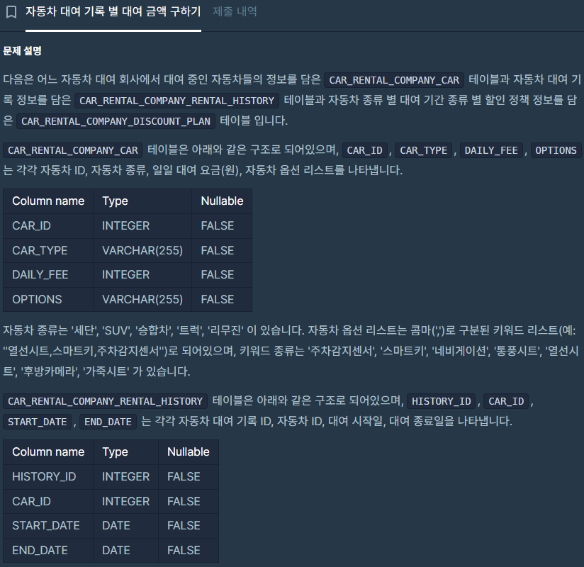 car_rental_company_rental_history 테이블에서 DATEDIFF() + 1을 통해 대여 기간을 구해야 한다.