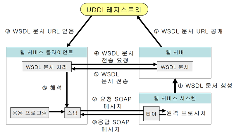 ① 웹 서비스 제공자는 웹 서비스의 기능, 즉 프로시저의 이름, 인자의 종류, 반환형의 종류, 전송 프로토콜의 종류 그리고 웹 서비스 종점 URL 등을 WSDL 문서로 작성해서 웹 서비스 소비자가 언제든지 다운로드 받을 수 있도록 웹 서버에 저장한다.
