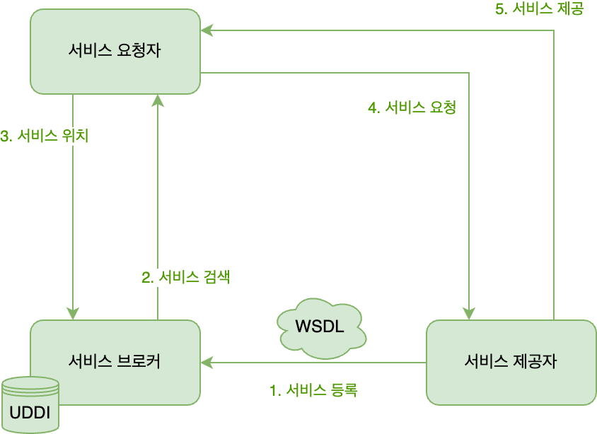 - 브로커(UDDI): 서비스 요청자가 "날씨 정보를 제공하는 서비스가 어디 있지?"라고 검색하면, 제공자의 정보를 알려준다.
