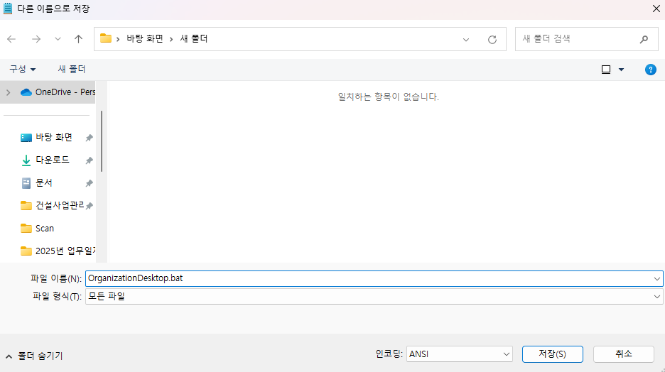 하지만 그렇게 해 보니 배치 파일을 실행 할 때 글자가 깨지는 현상이 발생해서 추후에 나중에 ANSI 로 수정하니까 한글이 깨지지 않았다. 저장 위치는 상관 없다. 바탕화면에 해도 되고 원하는 폴더로 지정한 후 저장한다.