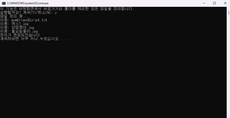 이렇게 배치 프로그램을 돌리면 바탕화면에서 YYYY-MM-DD 형식의 폴더가 자동 생성되어, 그 안에 바로가기와 폴더를 제외한 모든 파일이 들어가서 깔끔하게 정리된다. 그리고 어떤 파일들이 이동되었는지 실행 과정이 배치 화면에 표시된다.