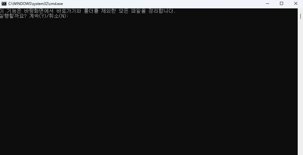 - "이 기능은 바탕화면에서 바로가기와 폴더를 제외한 모든 파일을 정리합니다. 실행할까요? 계속(Y)/취소(N)" 메시지를 보여주고 입력을 받아. Y를 선택하면 계속 진행하고, N을 선택하면 종료