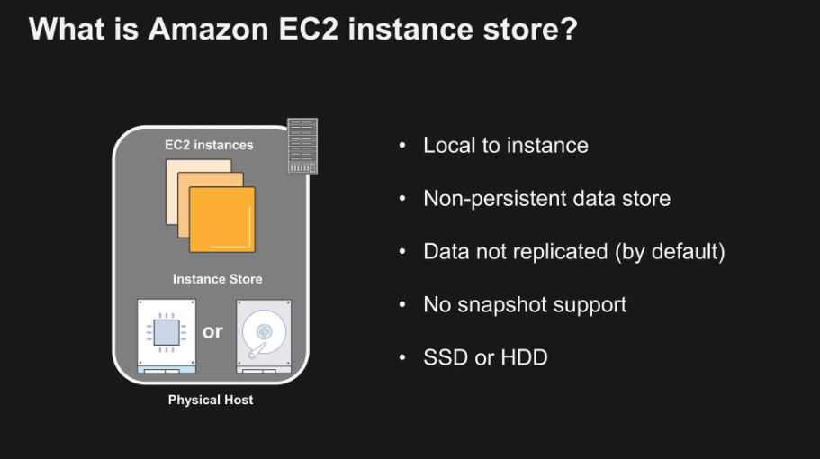 - Instance Store는 물리적으로 EC2 인스턴스와 연결된 NVMe SSD이기 때문에 IOPS가 매우 높음