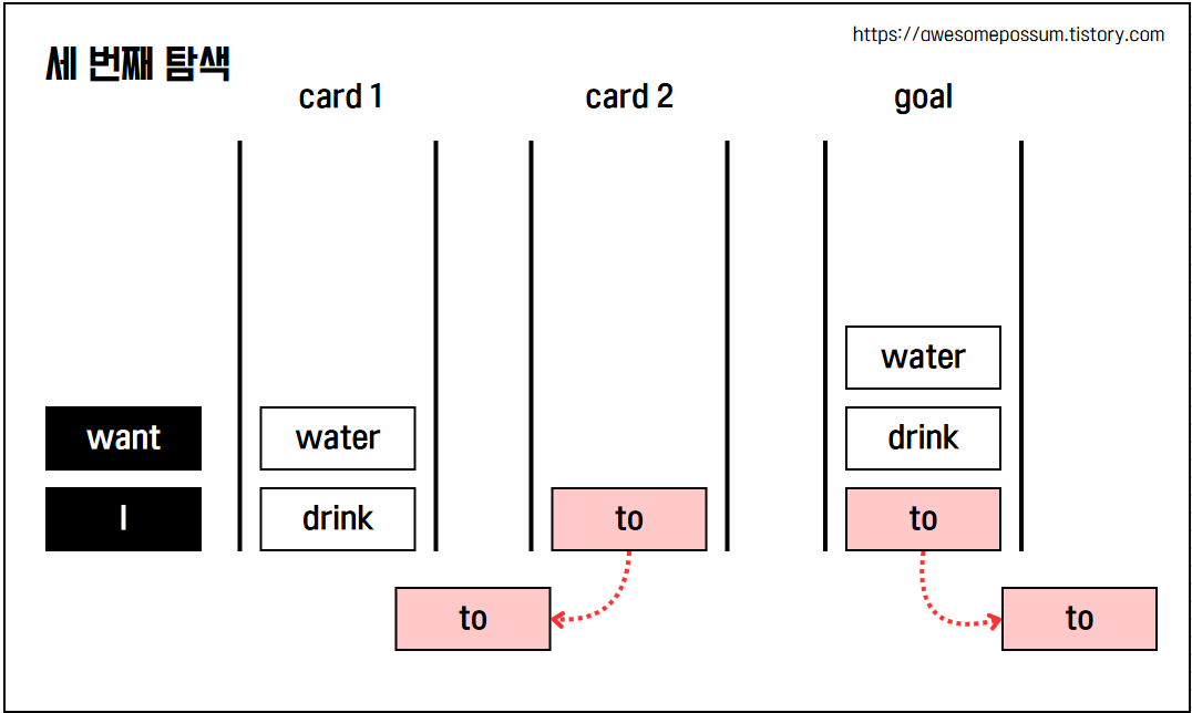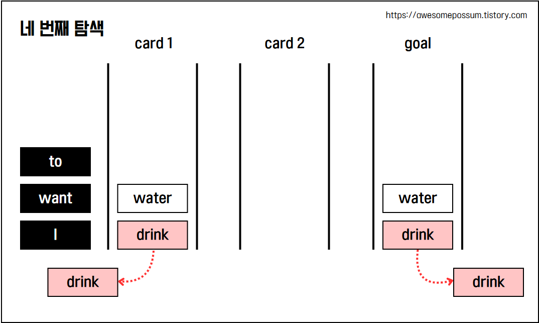 - goal의 front와 (card1 또는 card2)의 front의 값을 비교한다.