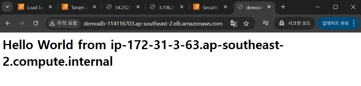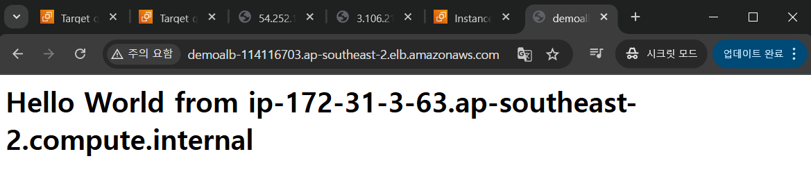 그리고 다시 ALB 화면으로 돌아와서 새로고침 하면 정상적으로 동작하고 있는 인스턴스에서만 응답 메세지를 보낸다.