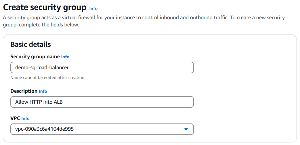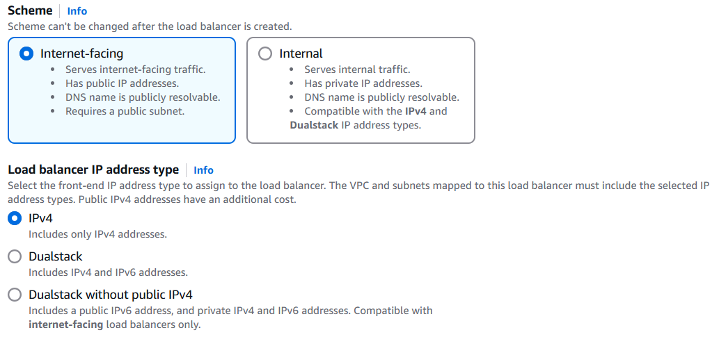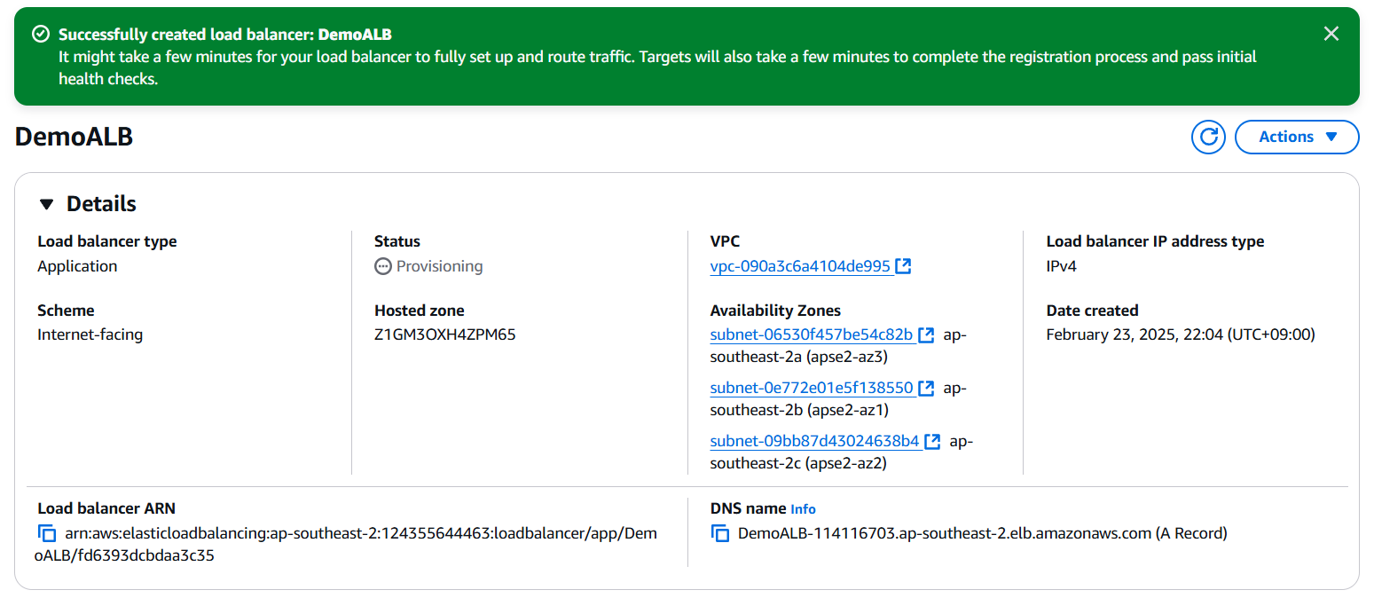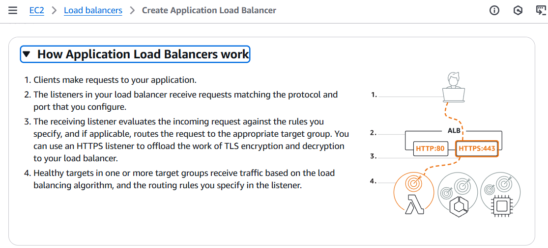 EC2 대시보드 > Load Balancer > create load balancer > ALB > 체계(Scheme)은 인터넷 연결(Internet-facing) > 주소는 IPv4 > Network mapping 에서 로드밸런서를 배포할 곳과 가용 영역을 선택한다(모두 선택해 줌) > Security Group 탭에서는 HTTP만 허용하는 Inbound rule을 가진 demo-sg-load-balancer 선택해줌 > Listeners and routing 에서 타겟 그룹 설정 (이 때 Create target group으로 인스턴스와 포트, 프로토콜 선택해야 함)