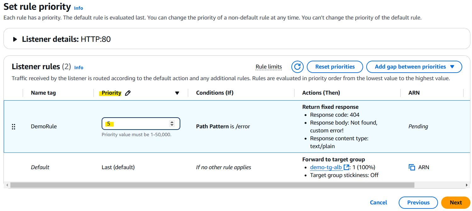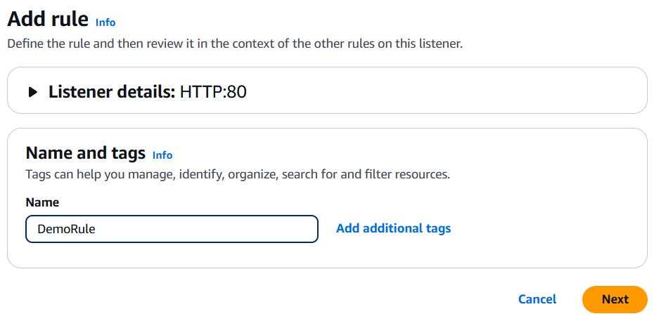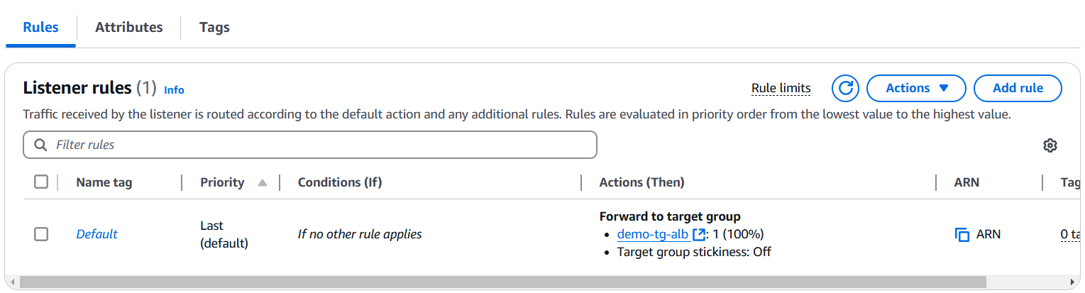 여기서 리스너 규칙을 추가 할 수 있다. 기본 규칙은 모든 요청을 ALB의 데모 대상 그룹으로 보내라는 것이다. 이 페이지에서 Add rule을 클릭해서 새로운 규칙을 추가할 수 있다.