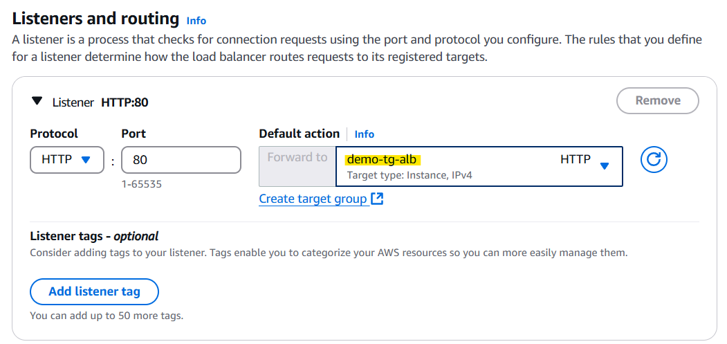 EC2 > Load balancers > DemoALB (로드밸런서 이름) > Listeners 탭 > HTTP:80 listener 클릭