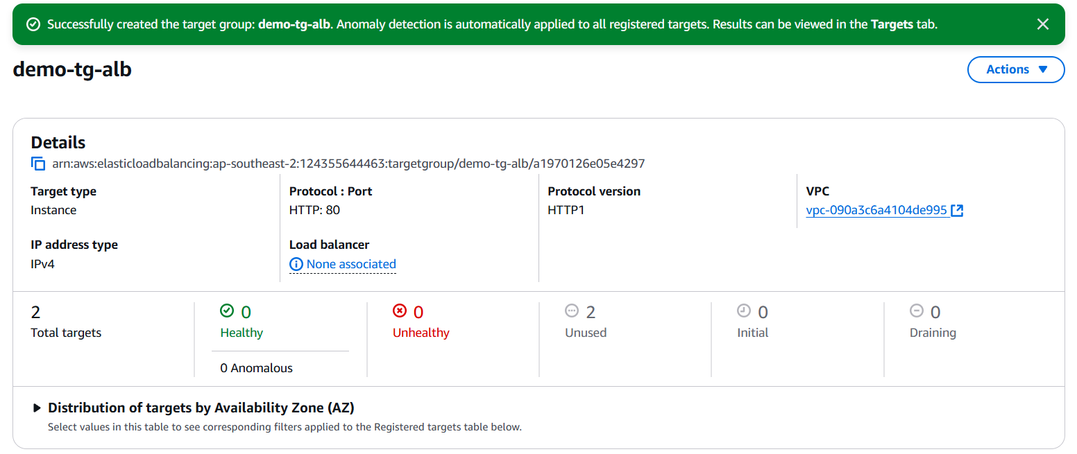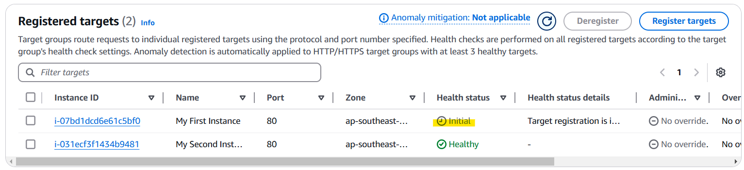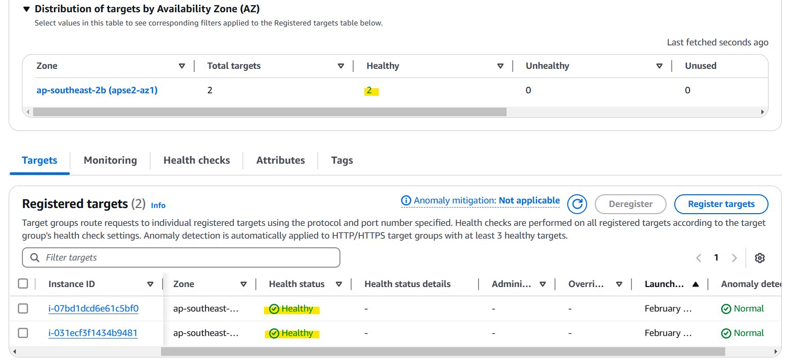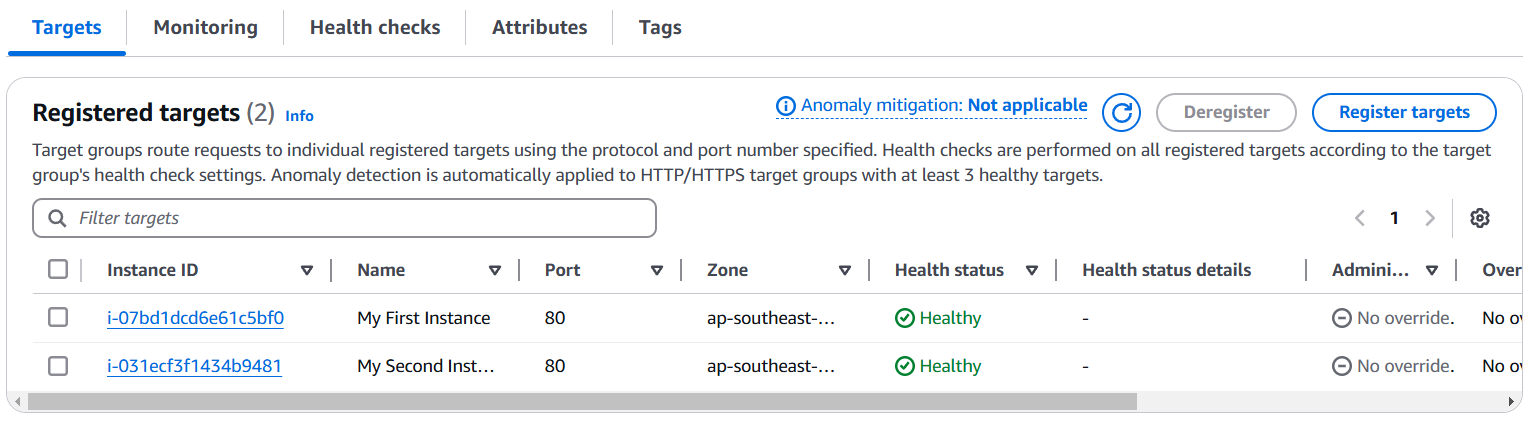페이지를 계속 새로고침하면 Instance A 가 실행되기도 하고 Instance B가 실행되기도 하는데, 즉, 내가 만든 애플리케이션 로드 밸런서가 두 EC2 인스턴스로 요청을 재전송하고 있는 것이다. 실제로 부하 분산이 일어나고 있는 것이다. 다시 Target Group 탭으로 돌아오면 두 인스턴스가 모두 정상(healthy) 상태로 뜨는 것을 확인가능하다. 즉, ALB가 대상 그룹을 통해 트래픽을 두 인스턴스로 고르게 전송하고 있다는 뜻이다.