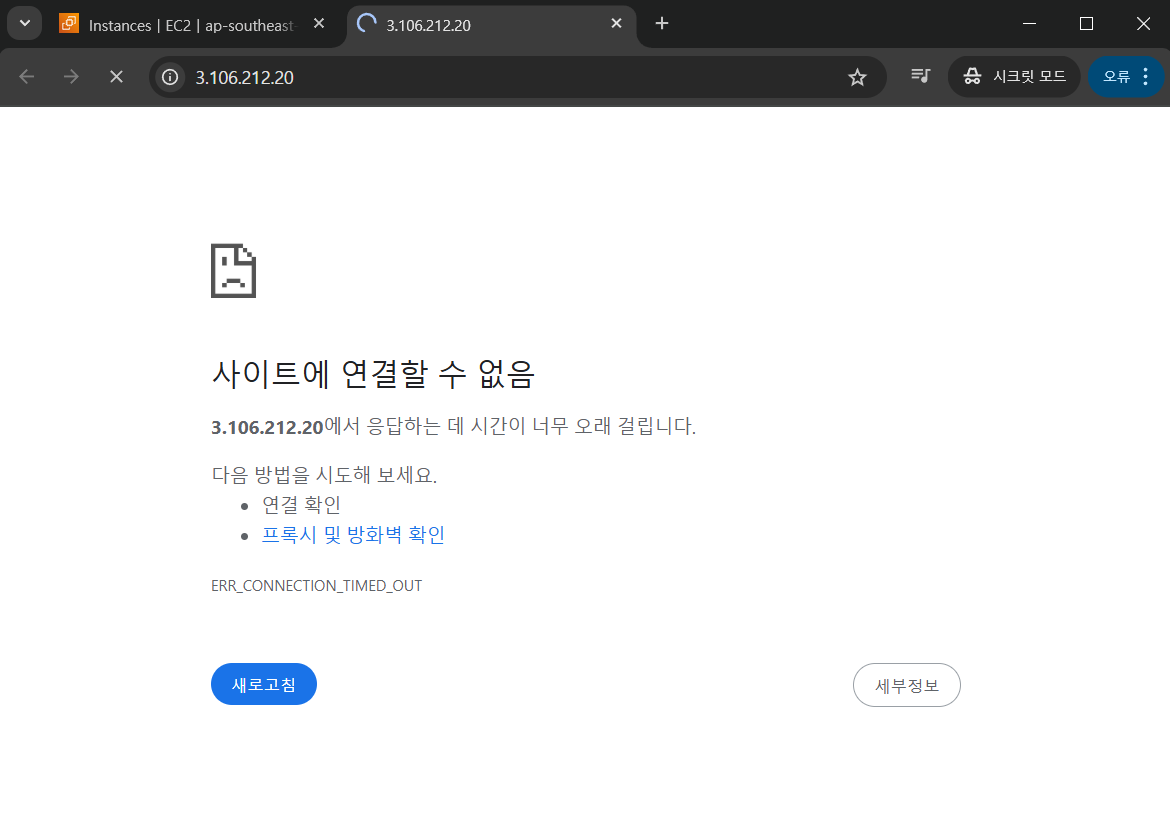 이제 Instance 의 IP주소로 열려 있는 서버를 새로고침하면, 시간 초과가 발생한다. (무한 로딩) 왜? 인스턴스에 액세스 할 수 없기 때문이다. 인스턴스에 직접 액세스하는 건 이제 불허된 상태다. 반면 로드 밸런서에서 새로고침하면 로드 배 ㄹ런서는 여전히 인스턴스에 액세스 할 수 있다. 보안그룹에 생성한 규칙에서 허용했기 때문이다.