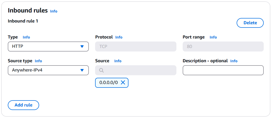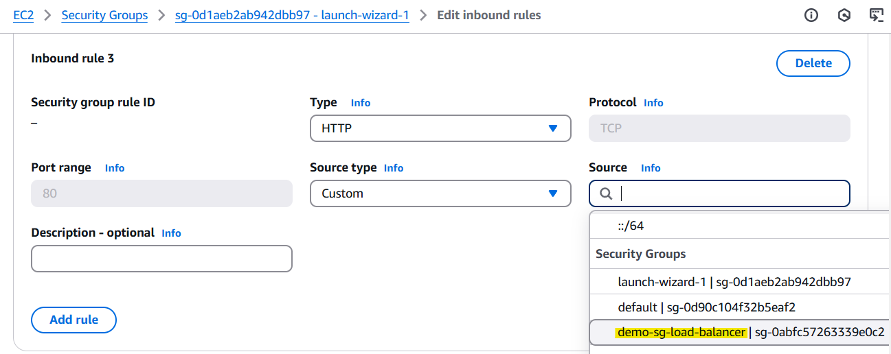 EC2 대시보드 > Security Groups > launch-wizard-1 인바운드 규칙을 살펴보면 현재 EC2 인스턴스로 허용되는 유일한 트래픽은 모든 트래픽이다. 이 트래픽을 로드밸런서에서 오는 트래픽만 허용으로 바꾸기, 기존의 HTTP를 삭제하고 새 HTTP를 추가하는데 이 때 Source는 우리가 허용하려는 로드밸런서의 보안 그룹 으로 설정해 준다.