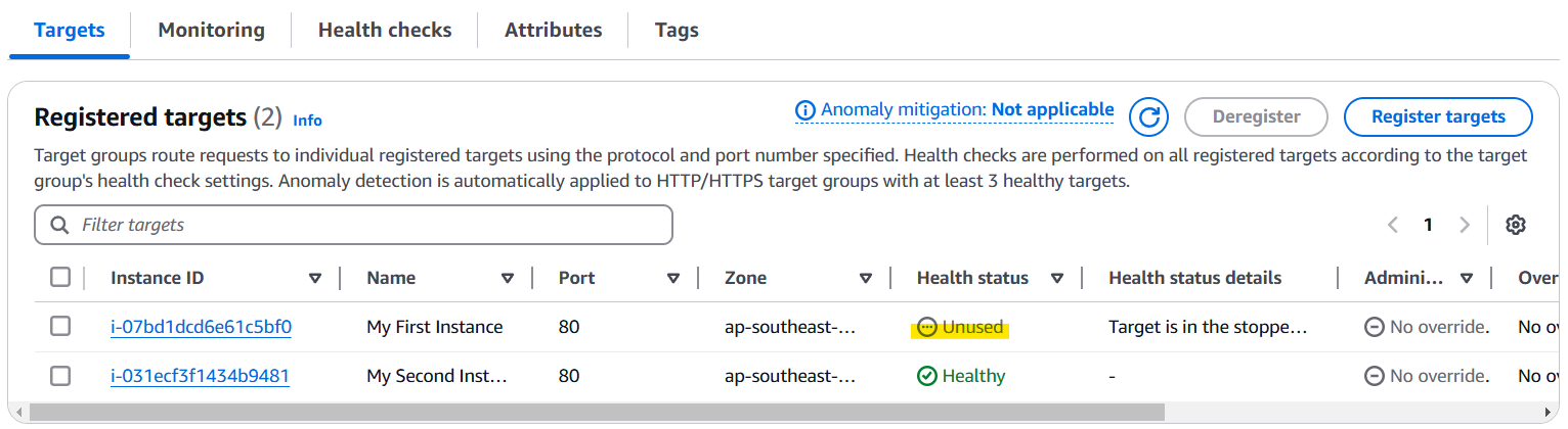 인스턴스가 중지되면 Health status는 Unused 상태가 된다.