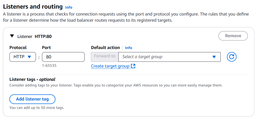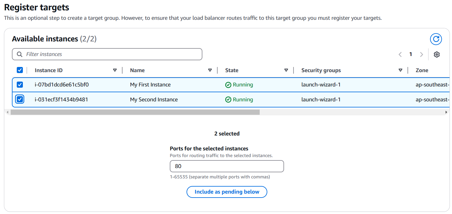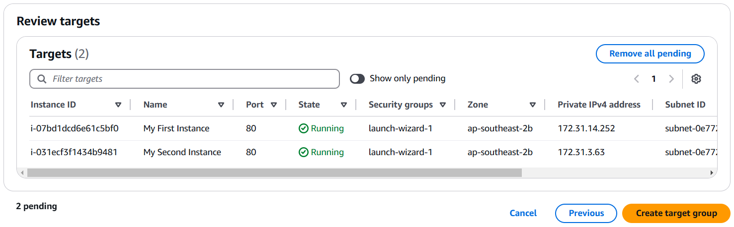 대상 그룹이라는 것은 내가 만든 EC2 인스턴스들을 뜻한다. 라우팅을 하려면 먼저 Create target group 링크를 클릭해서 그룹을 만들어야 한다. 인스턴스들을 선택하고 HTTP와 80포트로 지정해 준다. 그리고 나서 다시 두 EC2 인스턴스를 모두 포트 80에 대기(pending) 상태로 추가한다. 이렇게 Targets이 생성되었으면 다시 Listeners and routing으로 돌아가서 Default action의 Forward to 에서 해당 타겟 그룹을 선택하고 로드 밸런서 생성을 완료한다. 이렇게 하면 이 대상 그룹이 나의 로드 밸런서의 80포트에 있는 리스너와 연결된다.