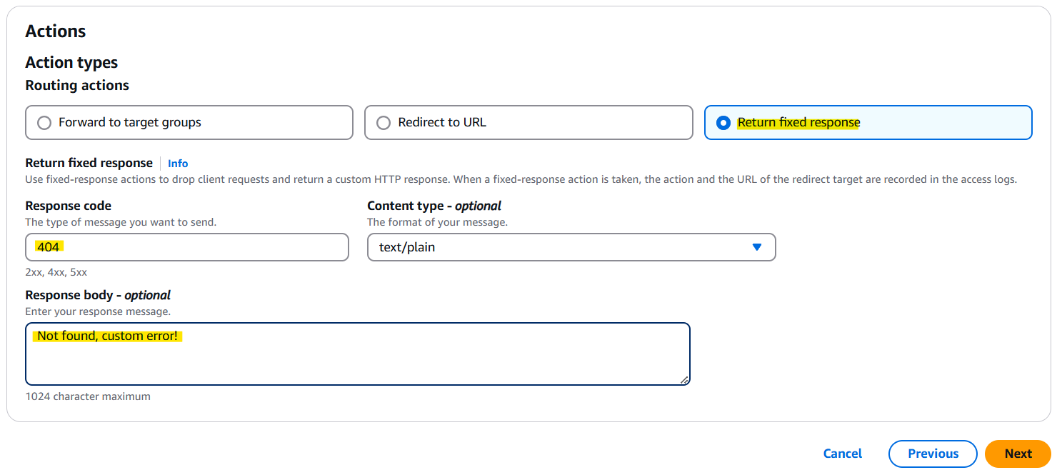 서버까지 요청을 전달하지 않고, ALB에서 직접 응답을 보낸다. JSON, HTML 등의 응답 본문을 설정할 수 있다.