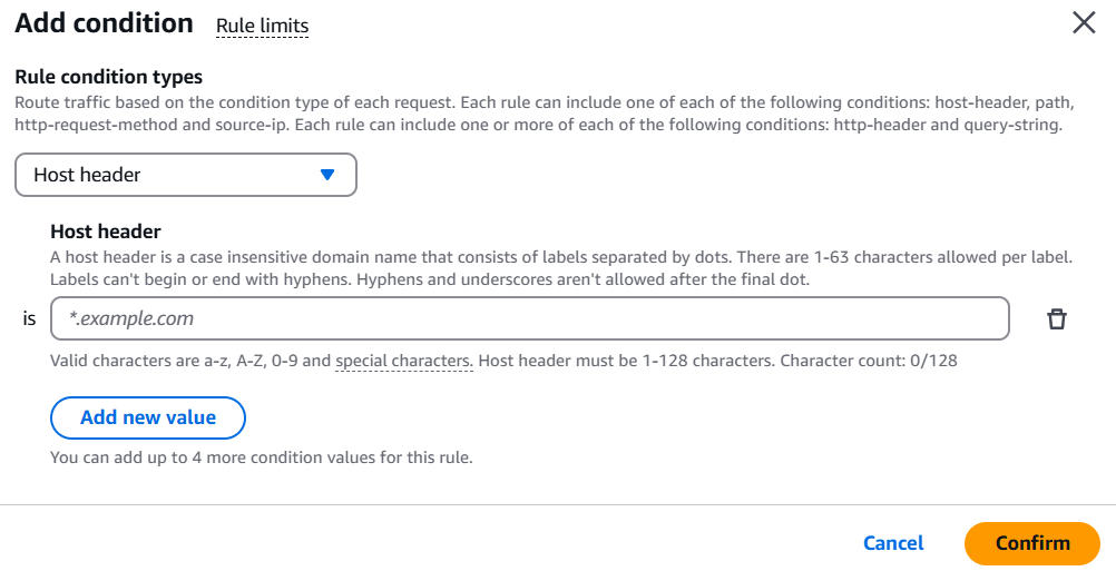 이제 컨디션 룰을 정해야 한다. Host Header는 도메인 주소를 추가하는 것이고, Path 옵션은 경로를 설정하는 것이다. /이하를 실행한다. HTTP 요청 메소드를 get 또는 post 등 원하는 대로 설정할 수도 있다. 소스 IP를 기준으로 필터링하고 조건을 지정할 수 있고, 쿼리 문자열과 HTTP 헤더도 설정할 수 있다. 아주 다양한 기능이 있다. 하지만 실습에서는 path를 사용할 것이다. 그리고 /error 로 경로지정을 해 준다.
