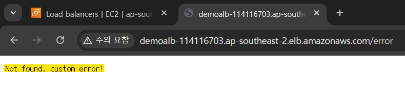 로드밸런서의 dns이름을 복사해서 주소창에 붙여넣기하고 끝에 지정한 경로인 '/error'을 붙여준다. 그러면 아래처럼 설정해 둔 에러 메세지를 반환한다. 실습 끝!