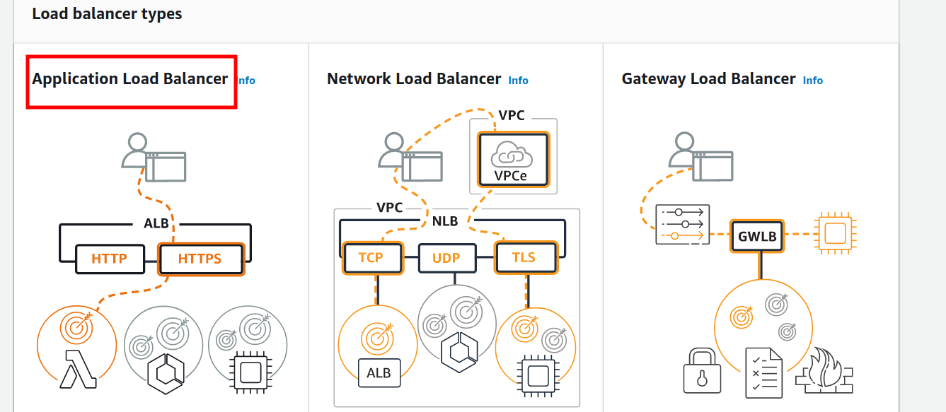 오늘 실습할 로드 밸런서는 Application Load Balancer이다. 아마존 AWS 에서 지원하는 로드 밸런서의 경우 Application Load Balancer, Network Load Balancer, Gateway Load Balancer이 있다. ALB는 HTTPS나 HTTP 타입의 트래픽을 위한 것이다. 그리고 NLB는 UCP, UDP 프로토콜 또는 TCP 기반의 TLS를 위한 것이다. (이건 초고성능 환경을 구축할 때 사용한다. 지연 시간을 최소로 유지하면서 초당 수백만 건의 요청을 처리하는 것이다.) 그리고 마지막으로 게이트웨이 로드 밸런서는 GWLB라고 하는데 보안, 침입 탐지, 방화벽에 특화되어 있다. 그래서 네트워크 트래픽을 분석하기 위한 로드밸런서라고 할 수 있다. 마지막으로 저번 포스팅에 언급한 CLB(Classic Load Balancer)은 이제 아마존에서 지원하지 않는다.