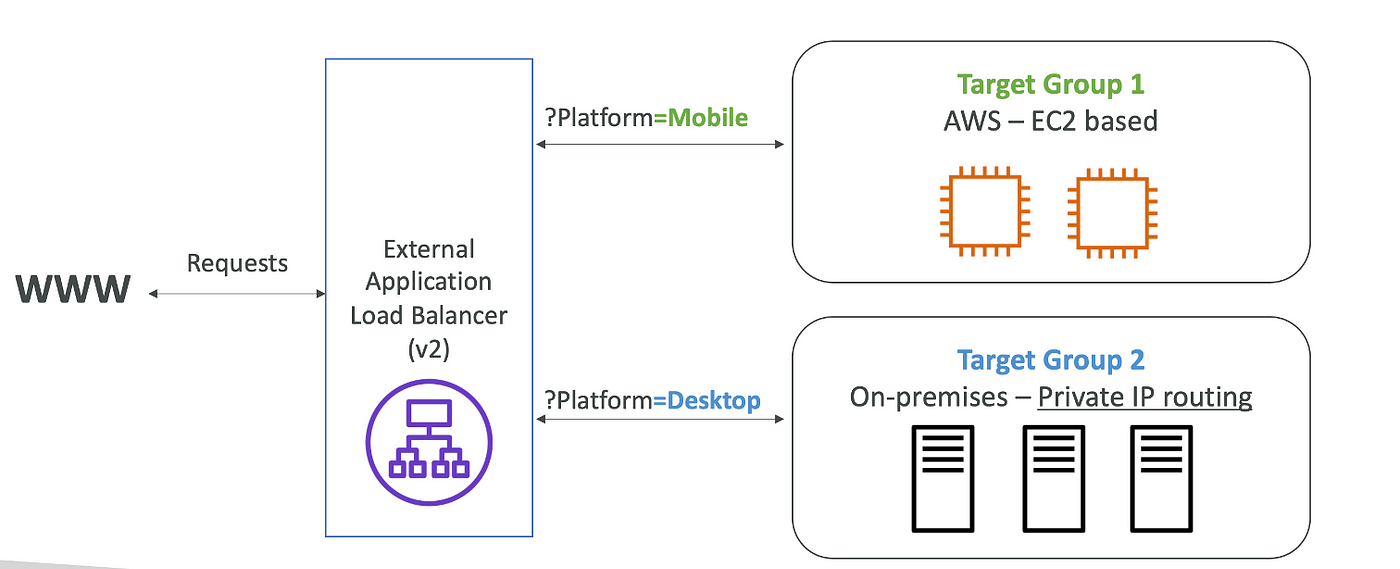 URL에 ?Platform=Mobile 이 있는 경우 첫 번째 대상 그룹으로 리다이렉팅 되도록 ALB 에서 리다이렉션 라우팅 규칙을 만들 수 있고 ?Platrofm=Desktop이 있는 경우 두 번재 대상 그룹으로 리다이렉트 하도록 구성 할 수 있다.