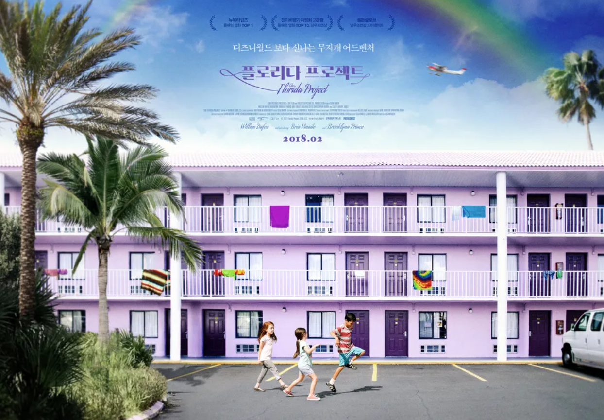 《플로리다 프로젝트》는 숀 베이커 감독이 연출한 영화로, 플로리다 디즈니 월드 근처의 모텔에서 살아가는 6살 소녀 무니와 그녀의 엄마 할리의 이야기를 다룬다. 다큐멘터리 같은 전개로 다소 느릴 수 있으나, 아이들의 천진난만한 모습과 아름다운 배경이 어우러져 인상적이다. 주요 배경인 보라색 ‘매직 캐슬 모텔’은 실제 올랜도 지역의 저소득층 주거 모텔을 기반으로 하며, 전 세계에서 가장 행복한 곳이라 불리는 디즈니 월드와 그 주변 빈곤층 커뮤니티가 공존하는 현실을 보여준다.