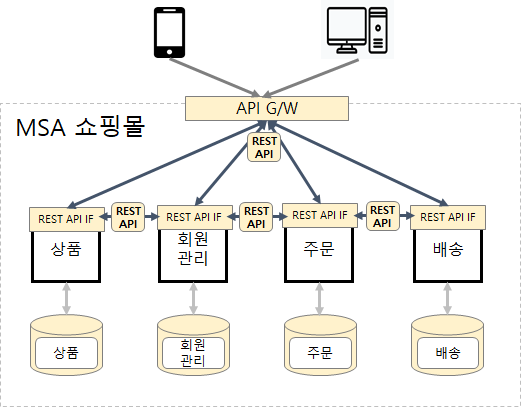 - 기능별로 서버를 분리하여 API를 통해 통신 (ex: 주문 서비스, 결제 서비스, 배송 서비스 각각 분리)