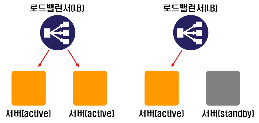 - 운영 서버(Active)가 동작하는 동안 다른 서버(Standby)는 대기 상태