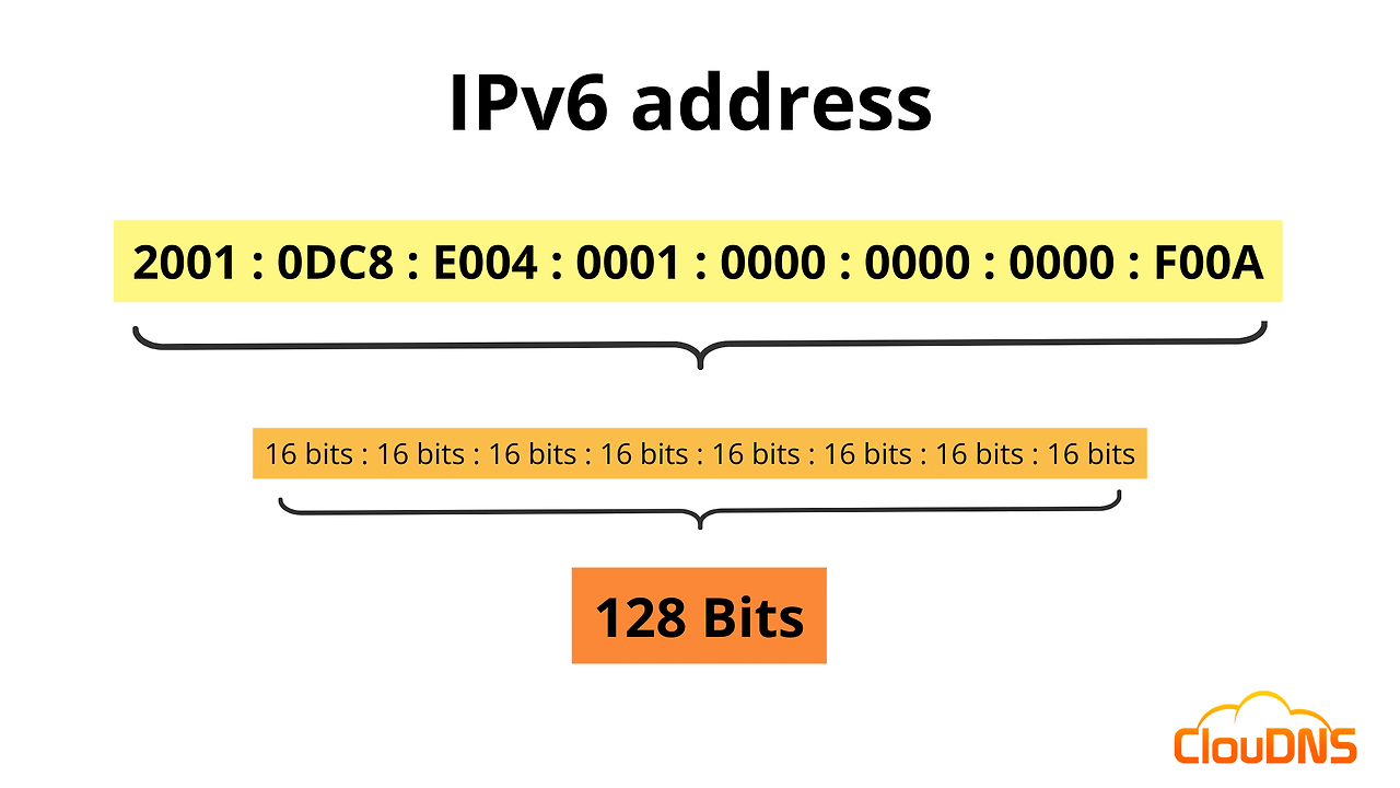 IPv6 주소는 일반적으로 콜론(:)으로 구분된 16진수 8개 그룹(각각 16비트)으로 구성된다.