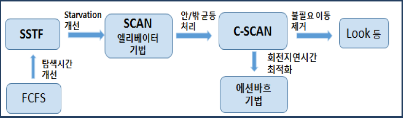 헤드가 진행하는 과정에서 각 실린더에 대해 디스크팩의 한 번의 회정 시간 동안만 입출력 요구들을 처리하는 기법이다.