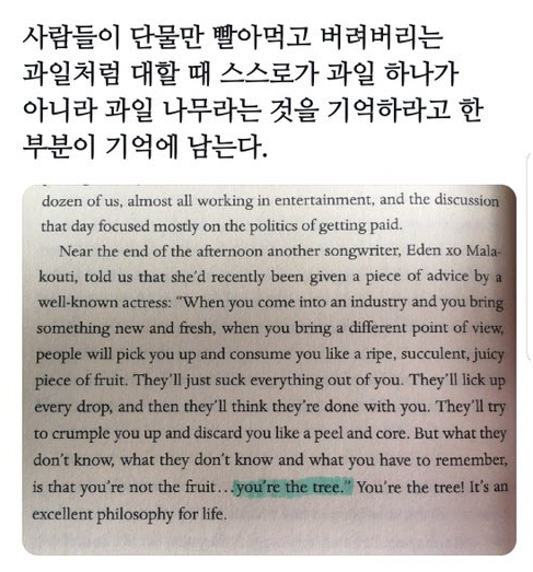 사람들이 단물만 빨아먹고 버려지는 과일처럼 대할 때 스스로가 과일 하나가 아니라 과일 나무라는 것을 기억하라는 말