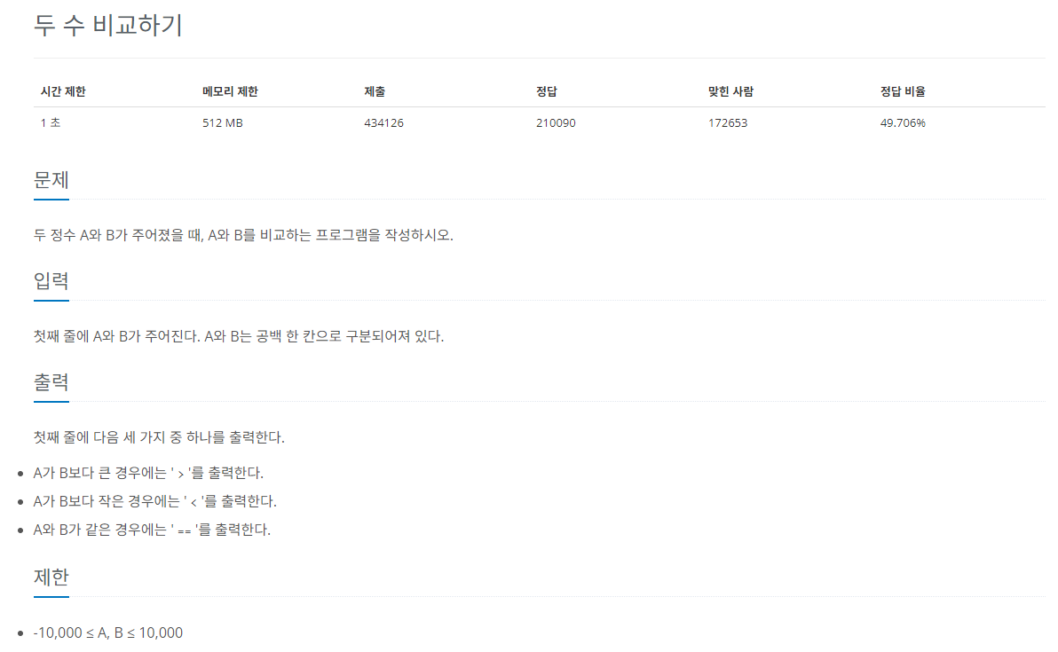 두 정수 A와 B가 주어졌을 때, A와 B를 비교하는 프로그램을 작성하시오.