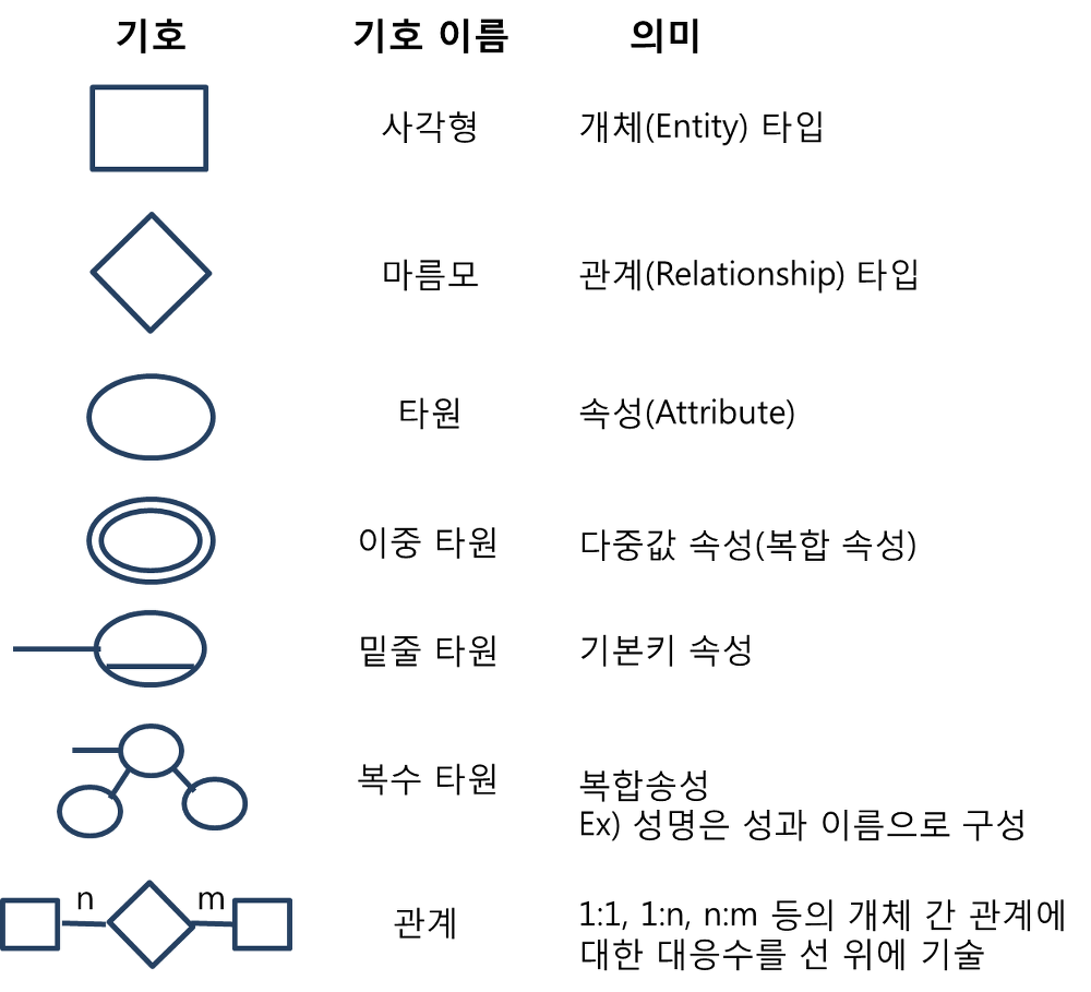 | 관계 (Relationship) | 두 개체 간의 의미 있는 연관성 및 연결 구조 (마름모) → 일대일(1:1) / 일대다(1:N) / 다대다(N:M) |