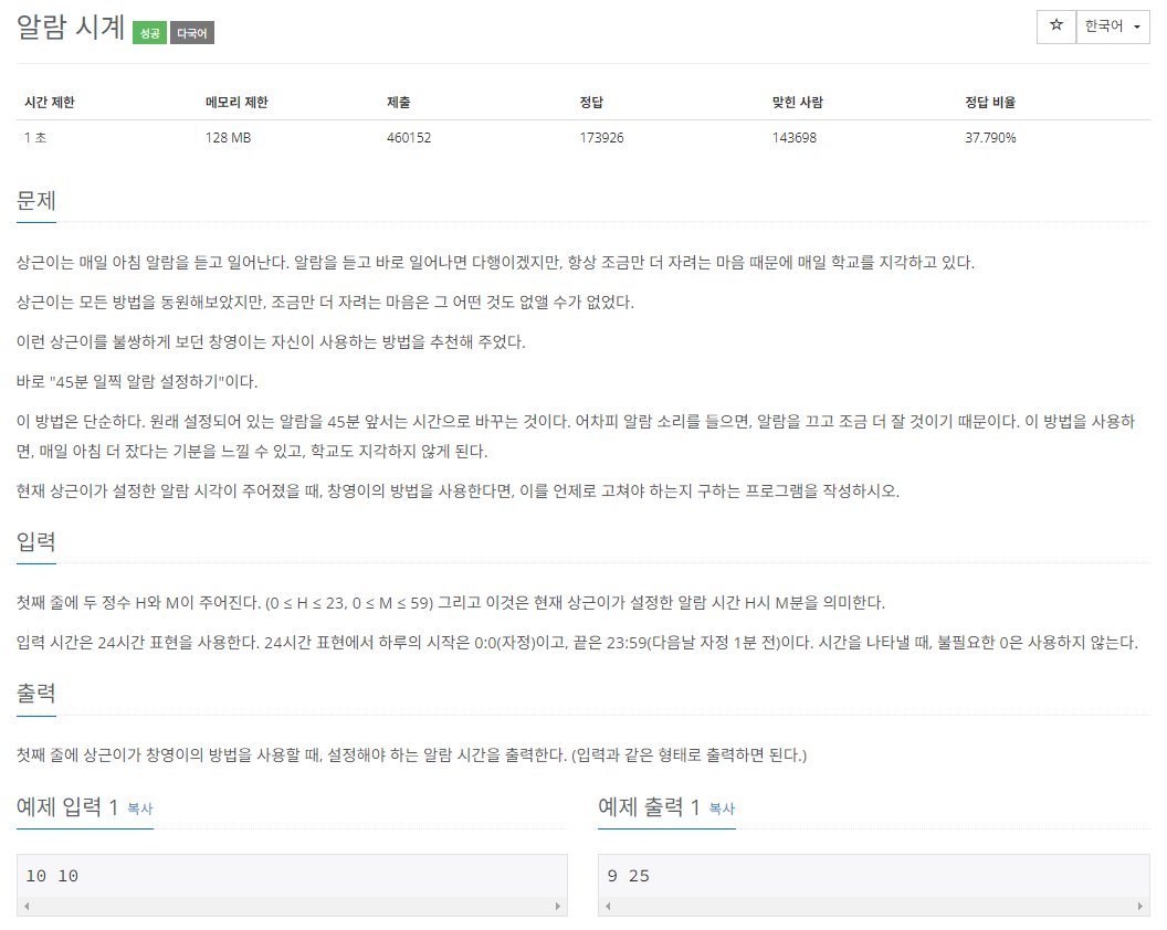 2. 45분보다 큰 경우에는 시(hour)는 그대로이고 입력받은 분(min)에 45를 빼주면 된다.