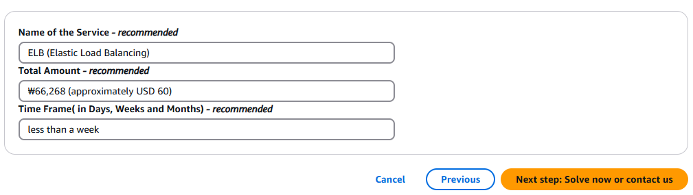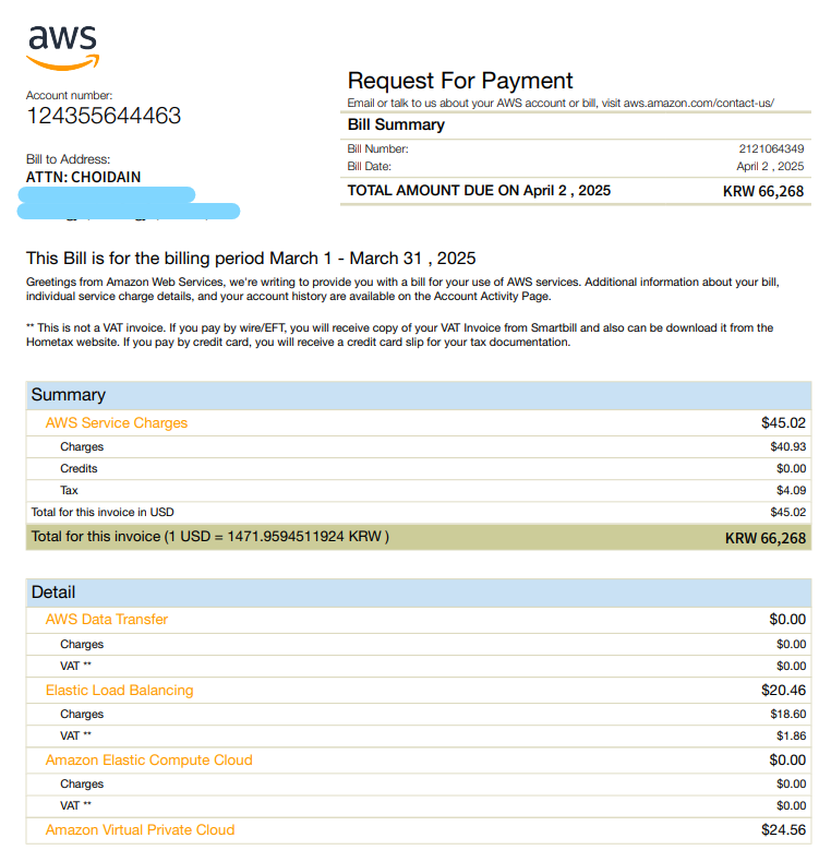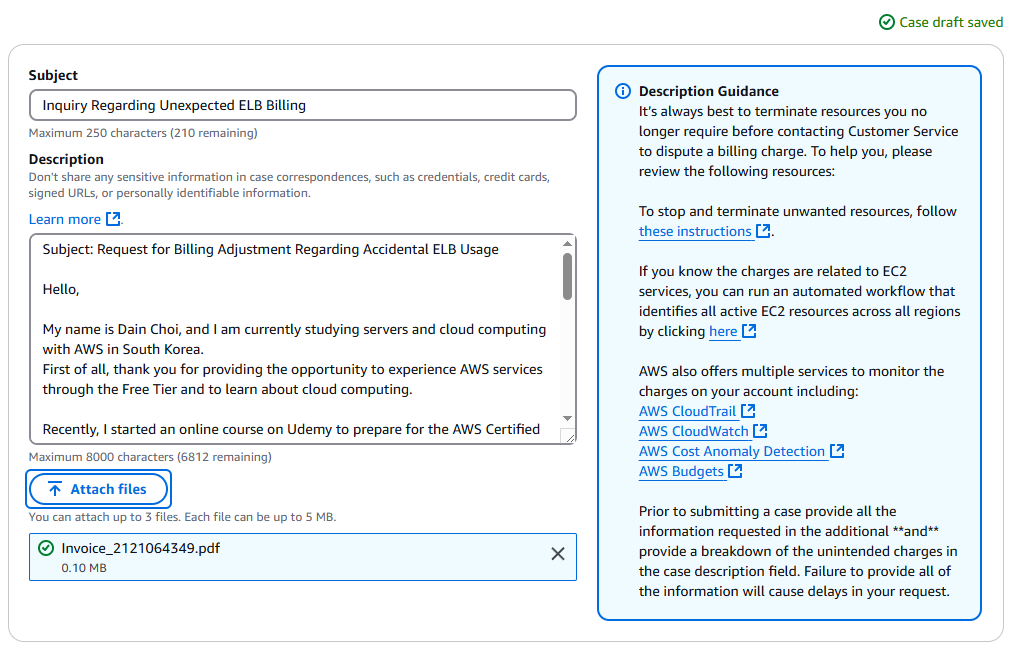 안녕하세요, 저는 한국에서 AWS를 통해 서버 및 클라우드 컴퓨팅을 공부하고 있는 최다인이라고 합니다. 먼저, AWS 프리 티어(Free Tier)를 통해 AWS 서비스를 경험하고 클라우드에 대해 배울 수 있는 기회를 제공해 주셔서 감사드립니다. 최근 AWS 공인 솔루션스 아키텍트 자격증을 준비하기 위해 Udemy에서 온라인 강의를 수강하기 시작했습니다. 강의 내용을 따라 실습하면서 ELB와 EC2 인스턴스를 생성했는데, 잠시 사용한 후 삭제했다고 생각했습니다. 그러나 최근 약 60달러에 해당하는 요금 청구서를 받게 되었습니다. 혹시 가능하시다면, 이번 청구에 대한 취소를 정중히 요청드리고자 합니다. ELB는 상업적인 목적으로 사용된 적이 전혀 없으며, 학습 후 실수로 삭제하지 않고 남겨둔 것 같습니다. 앞으로는 이러한 실수를 방지하기 위해 더욱 주의하여 학습하겠습니다.