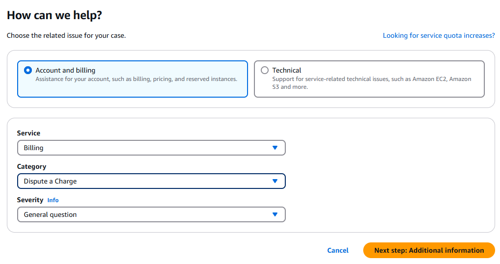 카테고리는 Dispute a Charge (청구에 대한 이의제기)로 지정한다.
